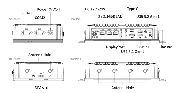 - 2x COM, 1x USB Type-C Gen 1, 2x USB 3.2 Gen 1, 1x USB 2.0
