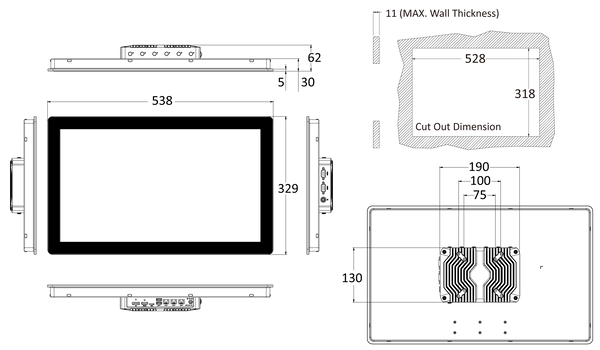 | Mounting | VESA Mount (75mm x 75mm/100mm x 100mm) Panel Mount (optional) |
