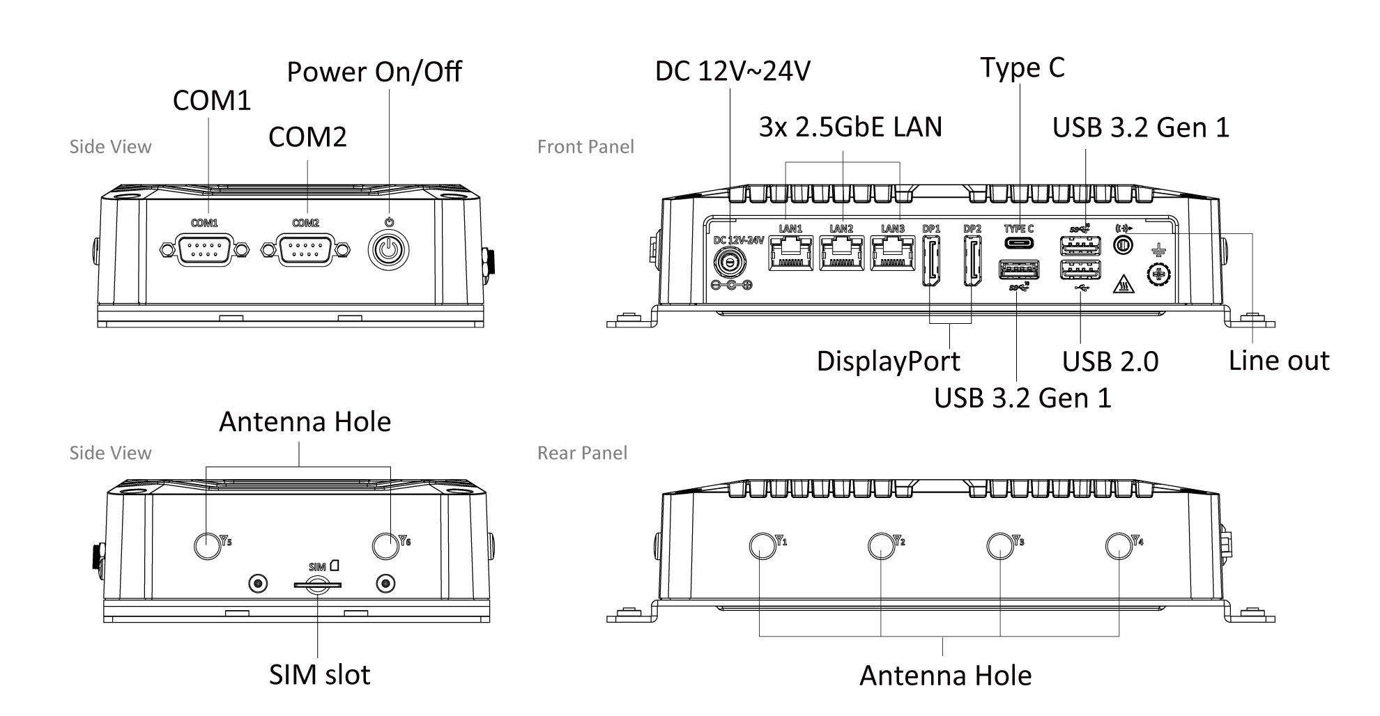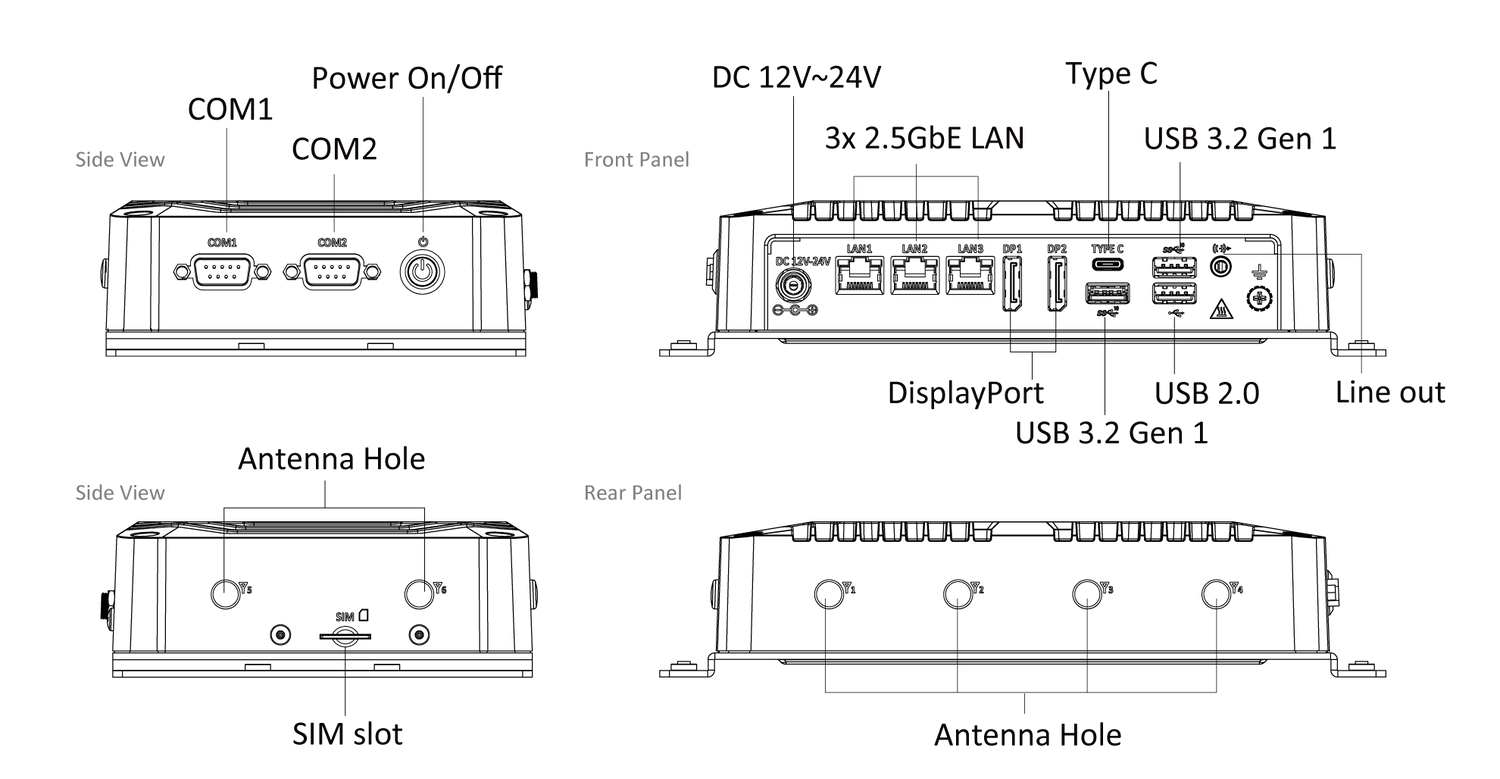 - 2x COM, 1x USB Type-C Gen 1, 2x USB 3.2 Gen 1, 1x USB 2.0