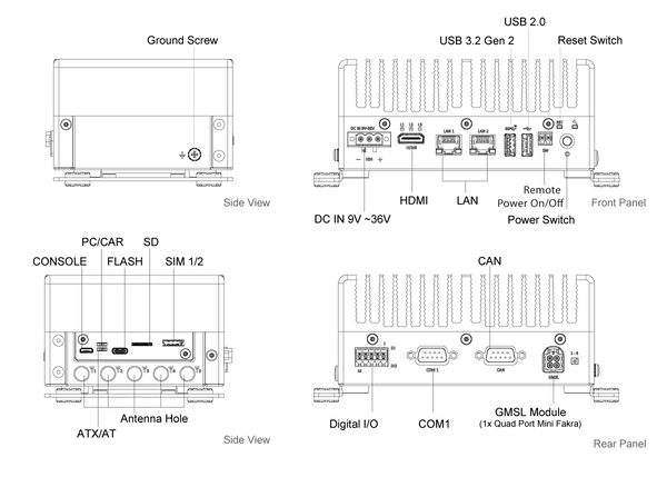 | Others | Service Panel: • 1x Micro USB (For Console) • 1x USB Type-C (For OS Flash) • 1x PC/CAR Mode Switch • 1x AT/ATX SW • 1x Micro SD Slot • 1x Dual SIM Slot 5x WiFi Antenna Holes 1x Power Switch and 1x Reset Switch 1x 2P Terminal Block for Remote SW 1x CMOS Battery Cable 1x 1x7-Pin Connector for MIC-IN & Line Out Intregated RTC Intregated G sensor & Gyroscope 1x M4 Gounding Screw |