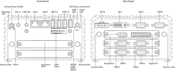 - 6x COM, 1x USB 3.0, 3x USB 2.0, 2x GbE