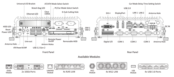 | Expansion Modules | 4-port GbE module with Intel® I350-AT4 Chipset, RJ-45 or M12 connector 4-Port USB with Renesas uPD720201K8 host controller 2-Port RJ45 10GbE with Intel X710-AT2 Chipset |