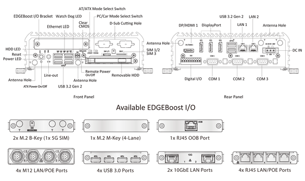 | Expansion Modules | EDGEBoost I/O Bracket: • 4-port 1GbE module with Intel® I350 Chipset, RJ-45 or M12 connector (PoE optional) • 2-Port 10GbE RJ45 with Intel X710 Chipset • 4-Port USB with Renesas uPD720201K8 host controller (share PCIe Gen2 x1 bandwidth) • 1x RJ45 port for OOB Management Module • 1x M.2 M-Key (PCIe x4 Lane, 2242/2260) for NVMe/AI Module • 2x M.2 B-Key 2242/3042/3052: - 2x M.2 (PCIe x2 Lane) for NVMe/AI Module or - 1x M.2 (PCIe x2 Lane) for NVMe/AI Module and 1x M.2 (PCIe x1 Lane + USB 3.2 Gen 1) for 4G/5G Module, 1x External SIM socket (M.2 attached) |