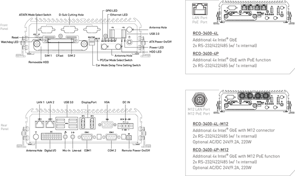 2x SIM socket - 5x RS-232/422/485 (w/ 3x internal), 4x USB 3.0, 2x USB 2.0