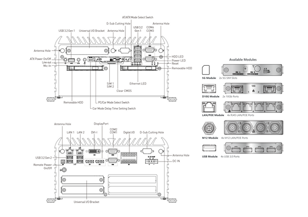 - 6x RS-232/422/485 (w/ 2x internal), 4x USB 3.2 Gen 2, 5x USB 3.2 Gen 1