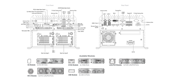 The RCO-6000-CFL Industrial Computer Series support rich expandability to boost wireless connectivity, streamline integration and unlock automation capabilities in harsh deployments. Leading edge and legacy technologies are easily incorporated into a powerful, intelligent IoT solution. Flexible add-in modules provide additional ethernet I/O ports in 1GbE (RJ45 & M12), 10GbE (RJ45), USB 3.0, and 5G ready M.2 for scalable connectivity in IoT deployments at the edge.