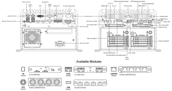 | Expansion Modules | Occupied One Universal I/O Slot: • 4-port GbE module with Intel® I350 Chipset, RJ-45 or M12 connector (PoE optional) • 2-Port RJ45 10GbE with Intel X710 Chipset • 4-Port USB with Renesas uPD720201K8 host controller (share PCIe Gen2 x1 bandwidth) • 1x M.2 for 5G (B Key, PCIe x1, USB 3.0, 3042/3052), Including 2x SIM socket, 1x SIM switch (1x Universal Slot Only) |