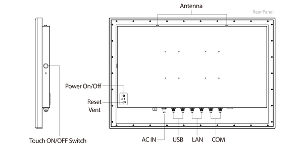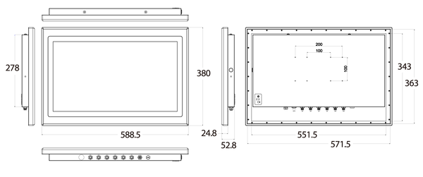 | Mounting Options | VESA Mounting Holes 100 x 100mm or 200 x 100mm Optional Yoke Mount, Panel Mount |