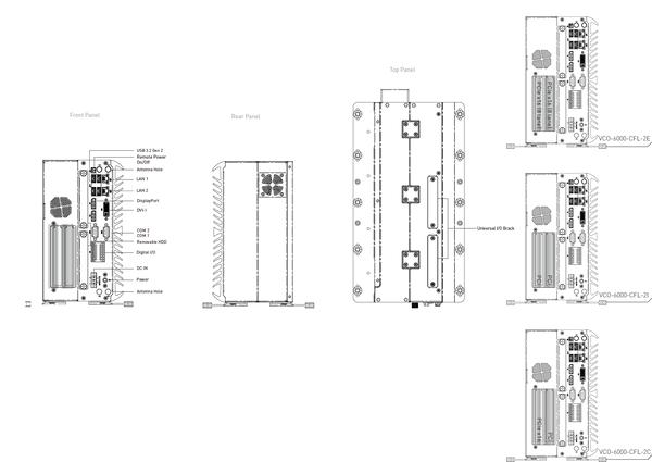 - 2x PCIe x8 (VCO-6000-CFL-2E) or 2x PCI (VCO-6000-CFL-2I) or 1x PCIe x16, 1x PCI (VCO-6000-CFL-2C)