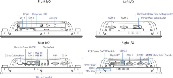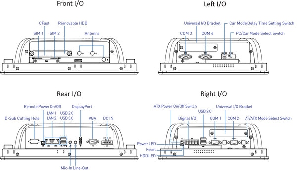 - 6x RS-232/422/485 (w/ 2x internal), 1x USB 3.0, 3x USB 2.0, Audio