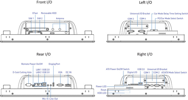 - 6x RS-232/422/485 (w/ 2x internal), 1x USB 3.0, 3x USB 2.0, Audio