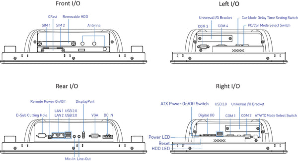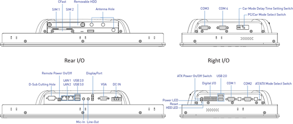 - 6x RS-232/422/485 (w/ 2x internal), 1x USB 3.0, 3x USB 2.0, Audio